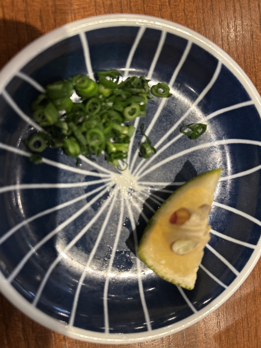 後乗せ、味変用のネギとカボスは別皿にのってきます。
